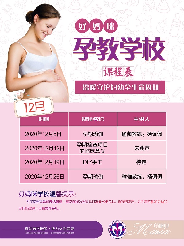 玛丽亚好妈咪孕教学校,通过形式多样的授课方式,向准妈妈准爸爸普及孕期知识,帮助孕妈顺利渡过妊娠、分娩和产褥期养育一个聪明健康的小宝宝。