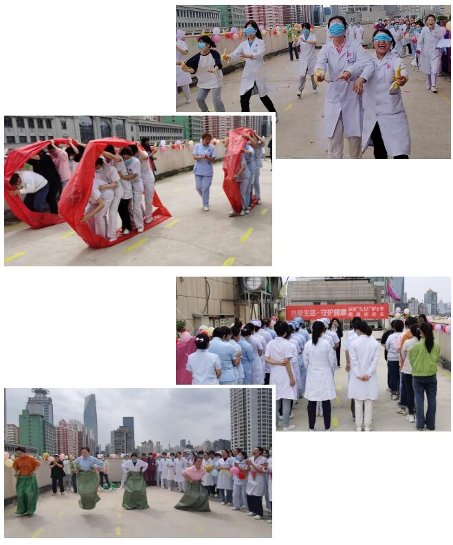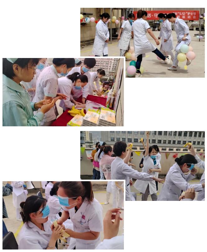 为了弘扬南丁格尔精神,传承护理文化,加强团队建设,提升团队协作能力,增强员工凝聚力,展现我院护理人员积极向上的精神风貌,营造健康的医院文化氛围,5月8日,主题为“热爱生活,守护健康”的趣味运动会如期举行。活动由护理部主任张红燕主持,院长杨春秀到场并发表了热情洋溢的讲话。随后,精彩纷呈,热闹非凡的趣味运动会正式开始。“车轮滚滚”比的是团队协作精神,五个人一组站在由横幅制成的布圈里,大家喊着号子,步调一致,齐心协力滚动布圈向前行进。那一刻,场内队员齐声喊着号子,场外观战人员加油声此起彼伏,场面既紧张又热闹,欢笑声不绝于耳。一场比赛下来,队员们红扑扑的脸颊和开心的笑颜真正诠释了什么是累并快乐着。“袋鼠跳”是单兵作战项目,参赛选手站在事先准备好的编织袋里,一声令下,队员手提袋子两边,向终点蹦跳而去,放眼望去活脱脱像一只只欢快的大袋鼠,又萌又可爱。“踩气球”是一场混战。大家相互追逐,奋力去踩别人脚腕上的气球。有人摔倒了爬起来继续追,别看这群小护士平时生活中温文尔雅娇娇俏俏,但是竞赛起来个个生龙活虎像个女汉子。“蒙眼吃香蕉”也是一个非常有趣的项目,吃得人和喂得人都得蒙起眼睛,喂得人从起点出发向坐在终点的同伴奔赴而去,尽量要保持不偏航将手中的香蕉投喂给同伴。场面一度有点混乱,因为围观的人比参赛选手还要兴奋和激动,一路跟跑,大声加油,将终点围得水泄不通。常说三个女人一台戏,这一大群女人,您可以脑补一下那场面,哈哈哈!每场比赛结束,参赛队员都能领取一份奖品,例如洗发水,洗手液,餐巾纸等等。友谊第一,比赛第二,重在参与。一片欢声笑语中,趣味运动会圆满结束。