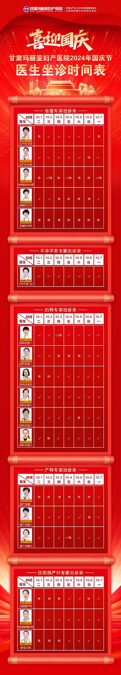 甘肃玛丽亚妇产医院2024年国庆节医生坐诊时间表