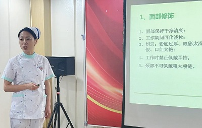 护理部主任张红燕运用图文并茂的PPT,结合自己的工作经验向大家讲解了护士服务形象标准、语言标准及行为标准。在培训过程中,张主任首先介绍了护士仪容仪表的规范,包括面部修饰、工作发饰、肢体修饰、着装规范、鞋袜规范及胸卡佩戴等方面的具体要求。她特别指出,护士应保持面部干净清爽,工作期间可化淡妆,但应避免过于浓重的妆容;工作发饰应整洁、简练,长发需佩戴护士头花并梳理整齐;着装则需整洁、合体,护士服应定期更换,并保持干净无破损,同时不得穿着护士服进出与医疗场所无关的地方。张主任指出,通过得体的仪表、行为和语言可以充显示出我院护理人员的职业素养。