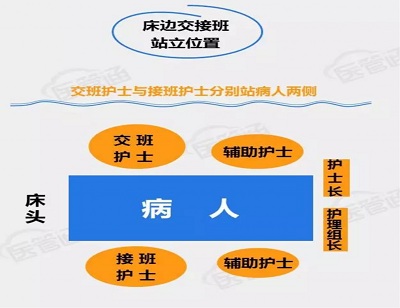 交接班站位:接班者与交班者分别站于患者左、右两侧,护士长、责任组长站于床尾,保证了交接班工作的井然有序,也体现出护理工作者的谨慎态度以及为患者提供安全、舒适、专业的护理服务是护理工作安全、可持续性发展的可靠保障的意义。