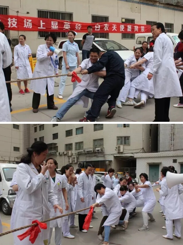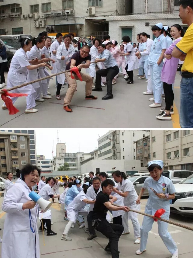 为了纪念“5.12”国际护士节,增强团队凝聚力和向心力,活跃员工的文化生活,5月8日下午,医院组织全体医护人员及后勤等部门开展了“趣味拔河比赛”,全院妇科、产科、医技、医助、手术室、客服 月嫂 保洁、治疗室输液室 、后勤队共8个代表队参加了比赛。现场气氛热烈,经过数轮竞争,分别有客服、月嫂、保洁代表队获得了冠军,手术室代表队获得了亚军,产科代表队获得了季军,颁奖仪式定于5月12日举行,届时将对上述团队分别作出奖励。